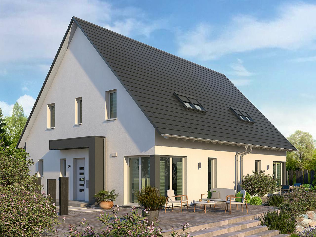 Diese Doppelhaushälfte basiert auf dem Grundriss des Double 2 und wurde durch eine Verbreiterung in der Traufseite um 11 m² erweitert, um noch mehr Wohnvergnügen zu bieten.