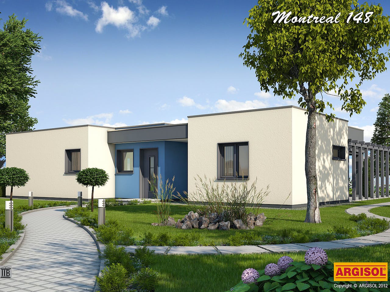 Dieser moderne Flachdachbungalow bietet eine Kombination aus klarer Architektur und höchstem Wohnkomfort. Seine äußere Form erhält der Bungalow durch mehrere aneinandergesetzte Kuben. Aufgelockert wird das Erscheinungsbild durch Vor- und Rücksprünge der Außenwände, sowie durch unterschiedliche Bauwerkshöhen. Im Inneren verteilen sich 148 m² Wohnfläche auf einer Ebene, ohne lästige Treppe und somit auch praktisch für jede Generation. Große Fensterflächen sorgen für helle und lichtdurchflutete Räume.