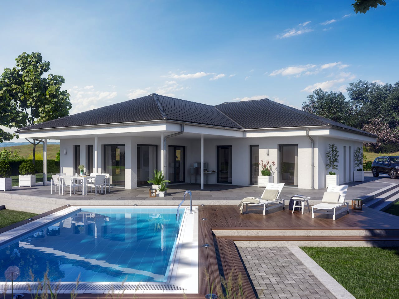 Der ausgesprochen geräumige Bungalow AMBIENCE 110 ist ein echtes Traumhaus. Auf der stattlichen Grundfläche von 10 m x 13 m sorgen ein Elternschlafzimmer mit Ankleide und zwei unterschiedlich bemessene Kinderzimmer für angenehmes Wohnen zu viert, bei dem jeder seine Privatsphäre leben kann.