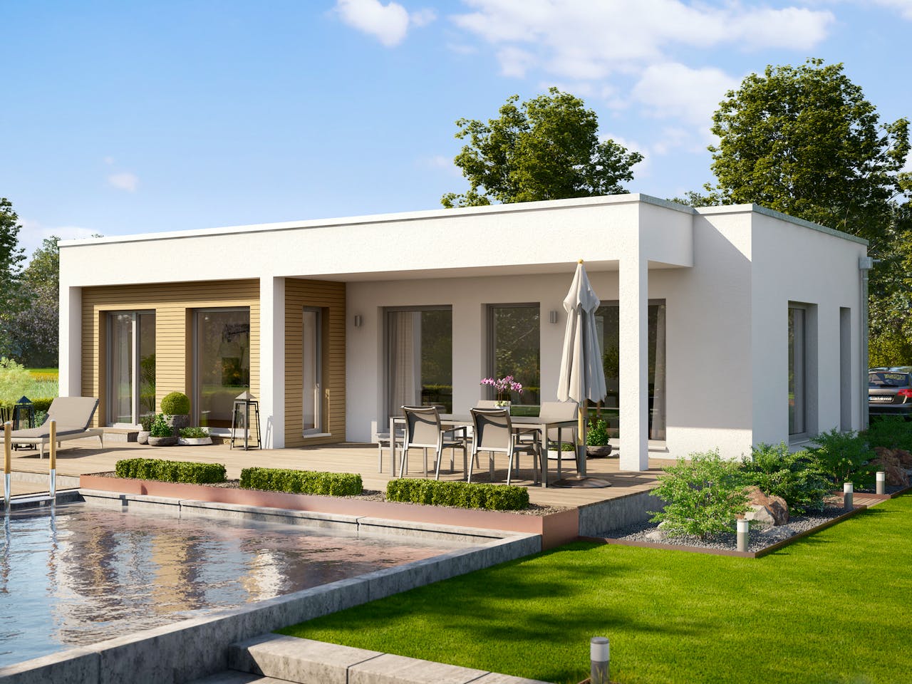 Moderner Flachdach-Bungalow mit Übereck-Panorama-Erker und Gartenlounge