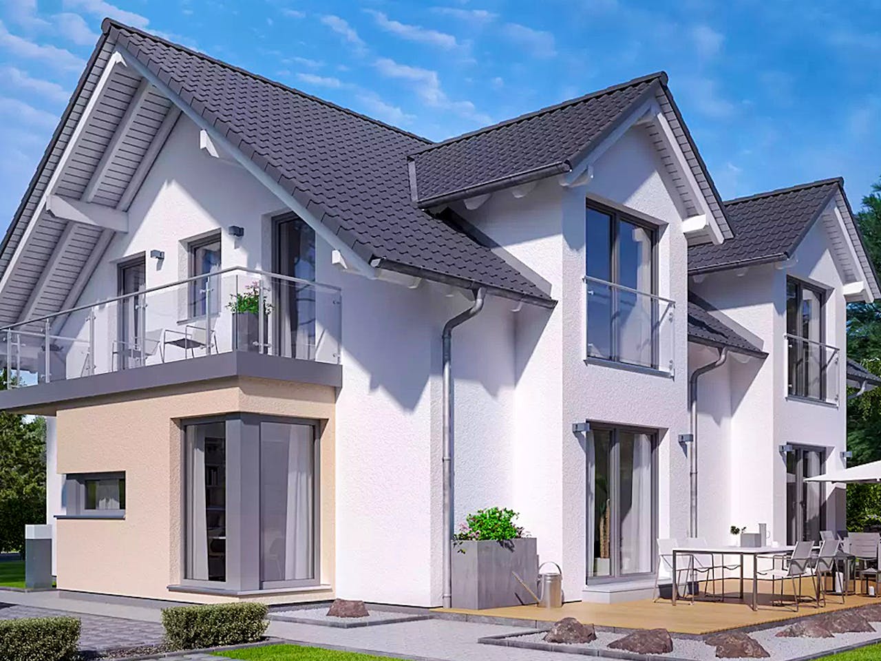 Zweifamilienhaus mit zwei Querhäusern und Rechteck-Erker mit Balkon