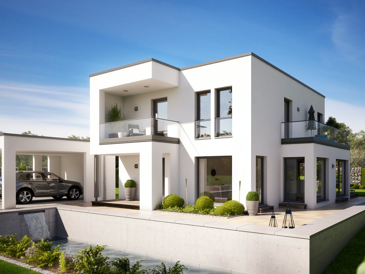 Traumhaus im Bauhausstil mit Doppelcarport, Erker und zwei Balkonen