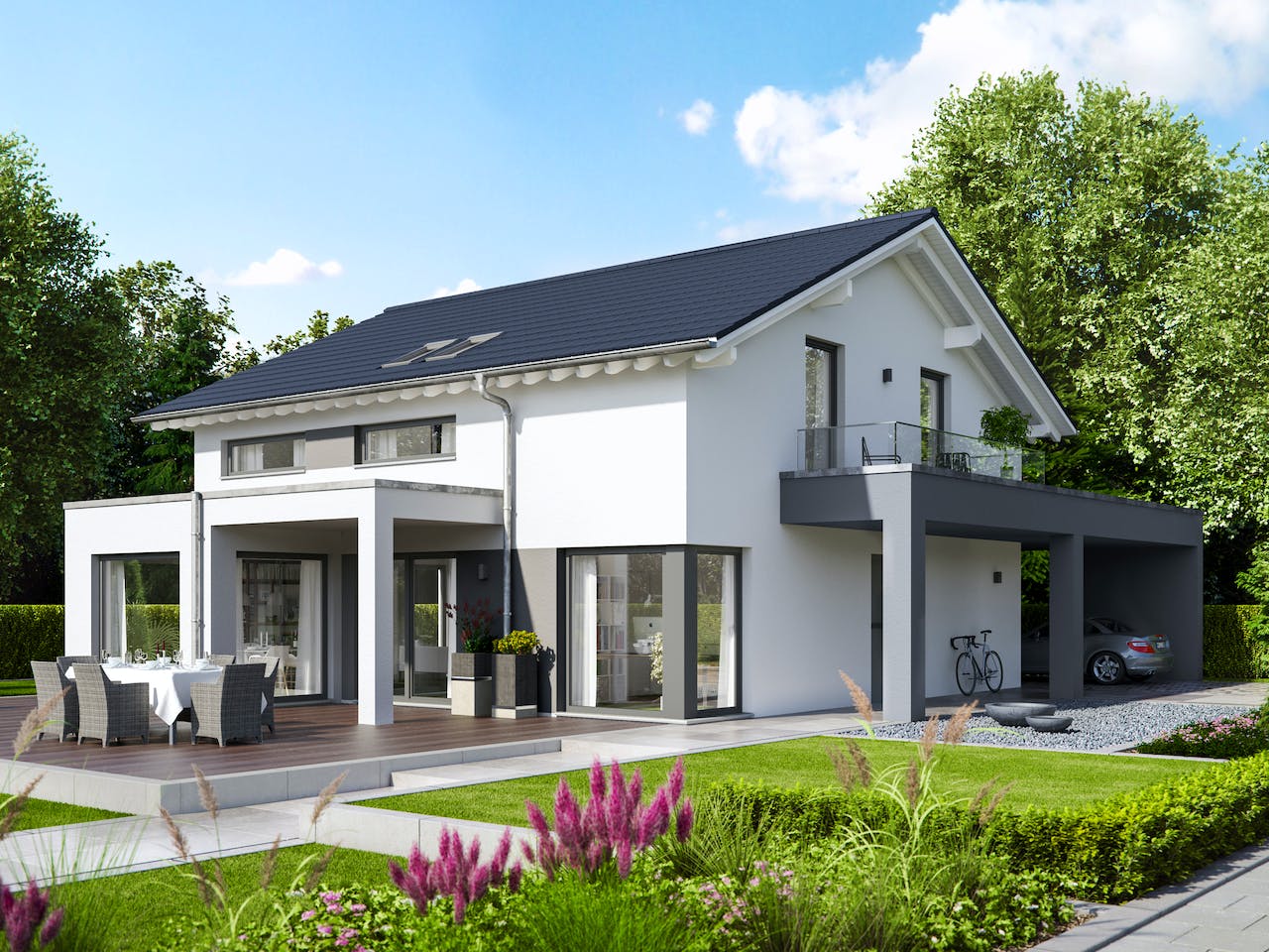 Modernes Einfamilienhaus mit Wintergarten-Erker und Carport mit Balkon