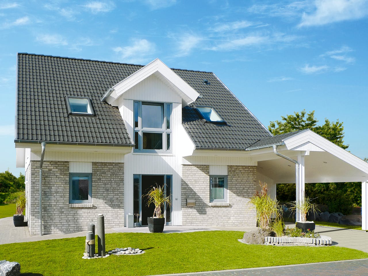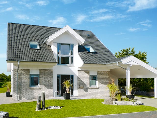 Ausgestattet mit einer hochgedämmten Außenhülle und einer Wärmepumpe, erreicht Haus „Adelby“ einen jährlichen Primärenergiebedarf von 42,8 kWh/m2a. Der Heizenergiebedarf liegt bei 10,9 kWh/m2a, auf Wunsch gibt es das förderfähige Effizienzhaus 55 auch mit Photovoltaik-Modulen als Plus-Energiehaus. Architektonisch wurde hier mit geschicktem Federstrich die traditionelle Architektur Norddeutschlands neu interpretiert: Außen runden sich der grau gedämpfte Klinker, die dunkle Dacheindeckung und die weißen Holzelemente zu einem eleganten Erscheinungsbild, innen geben Offenheit und Transparenz den Ton an. Ein Technikraum erlaubt das Bauen ohne Keller, Büro und Dusch-WC das barrierefreie Wohnen im Alter.