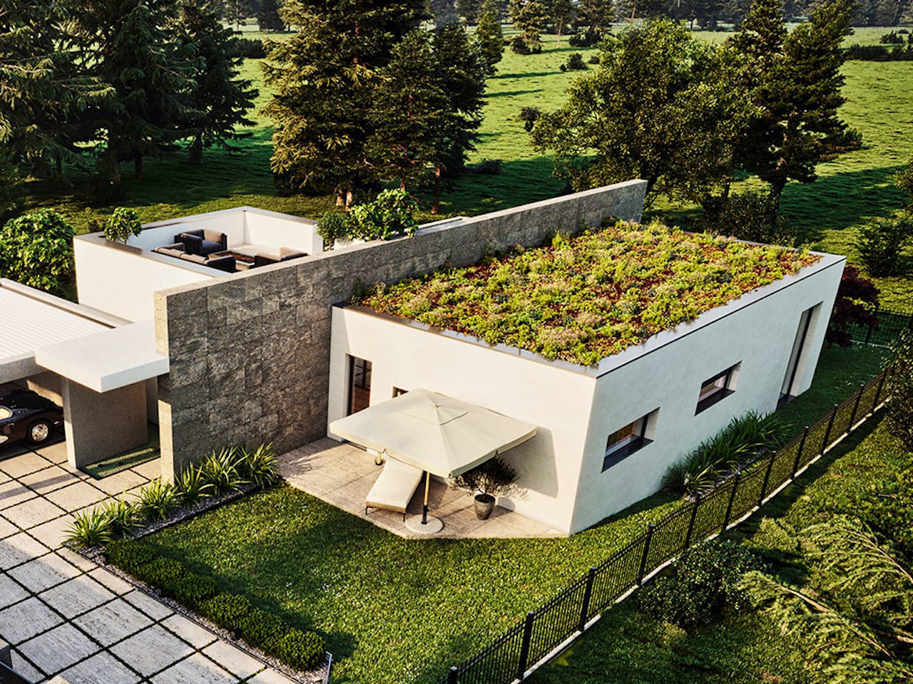 Der vorgelagerte Carport lässt das Hobby des Hausherren erahnen. Der großzügig angelegte Wohn- und Küchenbereich mit bodentiefen Fenstern verbindet sich direkt mit der Terrasse mit Koch-/Grill-Ausstattung. In den Innenräumen herrscht ein harmonisches Zusammenspiel zwischen weißen Wänden, Holzböden und -decken. Holzvertäfelte Decken sind ein klassisches Stilelement. Ebenso arttypisch sind die Travertinstein-Außenverkleidung und der Bodenbelag im Gartenbereich. Ein besonderes Highlight ist die Dachterrasse mit Aussicht auf die wunderschöne Landschaft. Ebenso naturnah und nachhaltig ist das begrünte Dach, das zur Dämmung des Gebäudes beiträgt. Haus Konstanz ist ein würdiger Vertreter des Mid-Century-Trends – Nachahmer sind ausdrücklich willkommen.