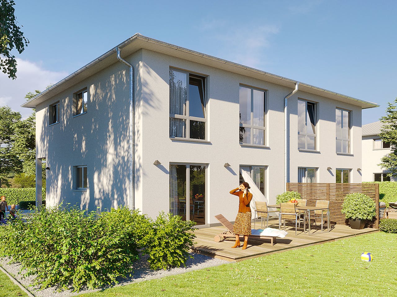 Unser Doppelhaus Hamburg vereint stilvolles Design mit einem durchdachten Raumkonzept und ist perfekt für Familien oder Freunde, die Nachbarschaft auf eine besondere Weise erleben möchten. Der überdachte Eingangsbereich heißt Sie herzlich willkommen und führt in ein Zuhause, das zum Wohlfühlen einlädt. Im Erdgeschoss erwartet Sie ein heller, offener Wohn- und Essbereich, der durch die großzügige Raumgestaltung und die angrenzende offene Küche zum Mittelpunkt des Familienlebens wird – ideal für gemeinsame Kochabende und gesellige Stunden. Eine stilvolle Treppe führt Sie ins Obergeschoss, wo zwei vielseitig nutzbare Zimmer sowie ein behagliches Schlafzimmer auf Sie warten. Abgerundet wird die Etage durch ein großzügiges Badezimmer, das Komfort und Entspannung verspricht. Das Doppelhaus Hamburg verbindet modernes Wohnen mit einem harmonischen Lebensgefühl – der ideale Ort, um schöne Momente mit Ihren Liebsten zu teilen.