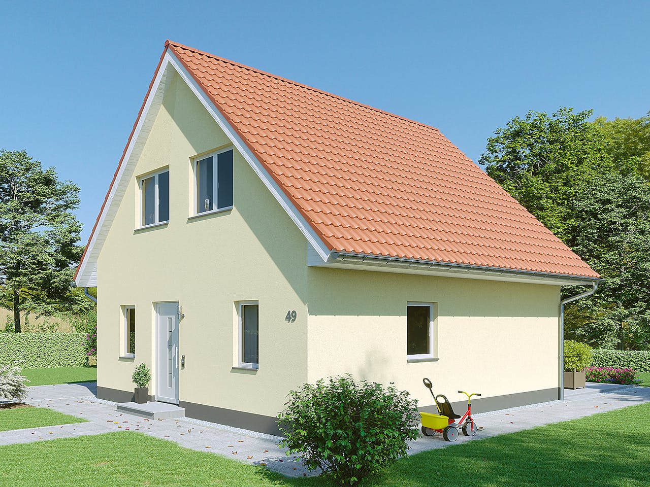 Das Einfamilienhaus Riesa überzeugt mit einer Nettoraumfläche von 100 m², die eine optimale Verbindung von Komfort und Funktionalität bietet. Die lichtdurchfluteten Räume auf zwei Etagen schaffen eine angenehme Wohnatmosphäre, die Raum für individuelle Bedürfnisse jeder Familie bietet. Im Erdgeschoss befindet sich ein großzügiges Wohnzimmer mit angrenzender, offener Küche, die einen direkten Blick in den Garten ermöglicht. Das Dachgeschoss umfasst ein geräumiges Schlafzimmer sowie zwei flexibel nutzbare Räume, die sich ideal als Kinderzimmer, Gästezimmer oder Arbeitszimmer eignen. Ein modern ausgestattetes Badezimmer komplettiert diese Etage. Dank der kompakten Bauweise ist das Haus Riesa besonders für kleinere Grundstücke prädestiniert und bietet dennoch jedem Familienmitglied ausreichend Rückzugsmöglichkeiten.