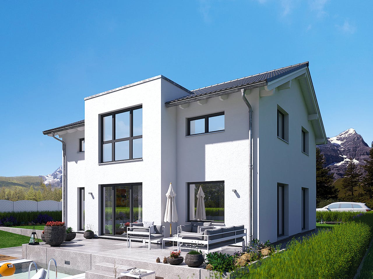 Das SENTO bietet viele architektonische Highlights über den 2,15 Meter hohen Kniestock und dem Satteldach mit einer 25° Grad Neigung oder dem Flachdach-Zwerchgiebel auf der Gartenseite mit zwei Terrassentüren im Erdgeschoss und drei bodentiefen Fenstern im Dachgeschoss.