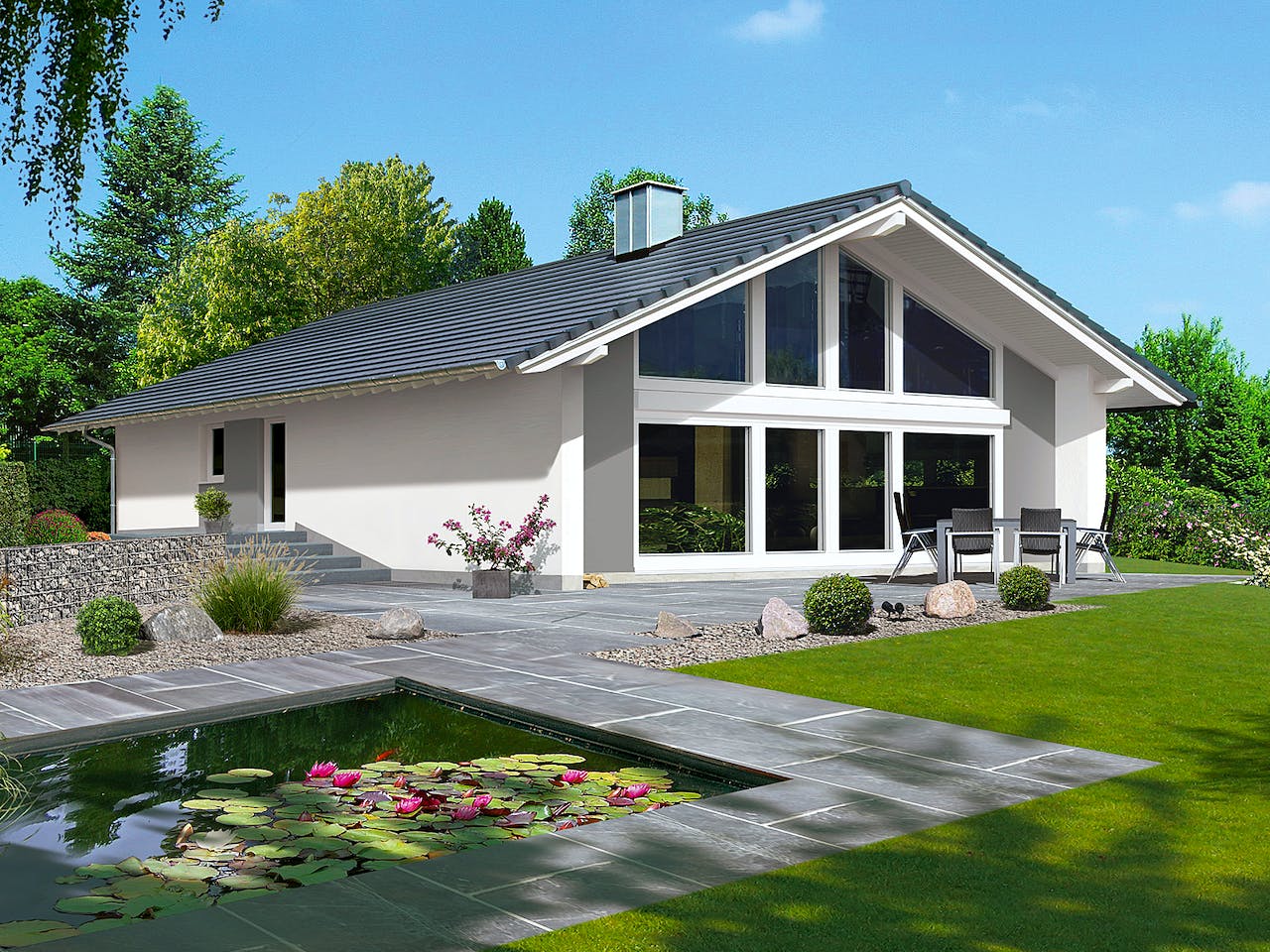 Die Panoramaglasfront schafft eine beinahe grenzenlose Ver-bundenheit mit der Landschaft.Bei diesem Bauprojekt erlaubtdie Weite des Grundstücks dem Bauherrn, das gesamte Haus so zu planen, dass während der Sommermonate große Teile des liebevoll angelegten Grundstücks nahezu nahtlos als Erweiterung der Wohnräume dienen können. Direkten Zugang zum Garten ermöglichen die beiden Schlafzimmer mit Gartenzugang, die Küche und der großzügige Wohnraum. Letzterer beeindruckt besonders durch den vollverglasten Giebel,der dem Raum eine bis unter den First reichende Offenheit verleiht. Keine Frage, eine Vollunterkellerung bietet sich bei einem Haus dieser Größenordnung zu mehr als nur zur reinen Nutzfläche an.