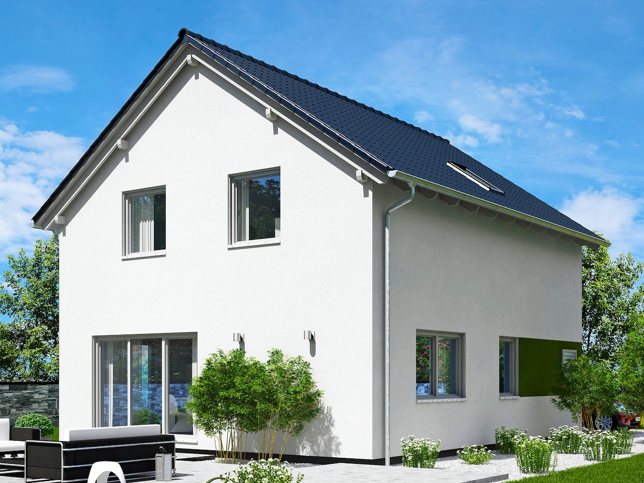 Dieses Hauskonzept ist wie gemacht für das Konzept des Homeoffice. Im Erdgeschoss ist so neben dem Hauswirtschaftsraum und dem Gäste-WC ein Büro, welches sich direkt an den großen Wohn-, Ess- und Kochbereich anschließt. Im Dachgeschoss des Hauses haben 2 gleichgroße Kinderzimmer ein Badezimmer, eine Abstellkammer und ein großes Schlafzimmer mit angrenzender Ankleide ihren Platz.