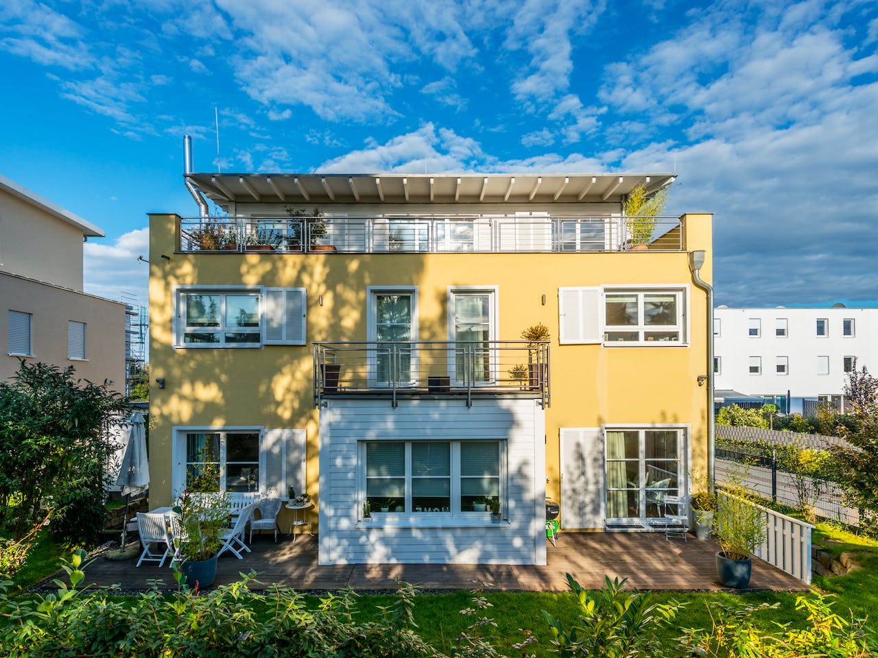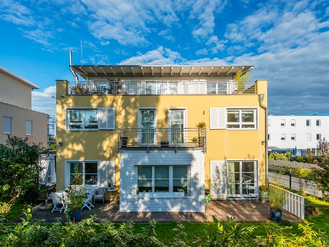 Der dreigeschossige Kubus wird von einem Flachdach bedeckt. Während die Fassade vom Erdgeschoss und vom ersten Obergeschoss verputzt und Sonnengelb gestrichen ist, besitzt das zweite, vom Grundriss her kleinere, Obergeschoss eine weiß gestrichene Holzverkleidung aus horizontalen, schmalen Massivholzbrettern. Auch der rechteckige eingeschossige Erkervorbau an der Gartenseite (Ostseite) wurde mit den gleichen Brettern verschalt. Passend dazu entschieden sich die Eigentümer für weiße Fensterrahmen, weiße Holzklappläden sowie eine weiße Haustür (Westseite). Auf dem Erkervorsprung befindet sich ein Balkon und ein Stockwerk darüber wird etwa ein Drittel der obersten Etage als Terrasse genutzt. Viele Fenster verschiedener Größen und Formen lassen rundherum den ganzen Tag reichlich natürliches Licht ins Haus.