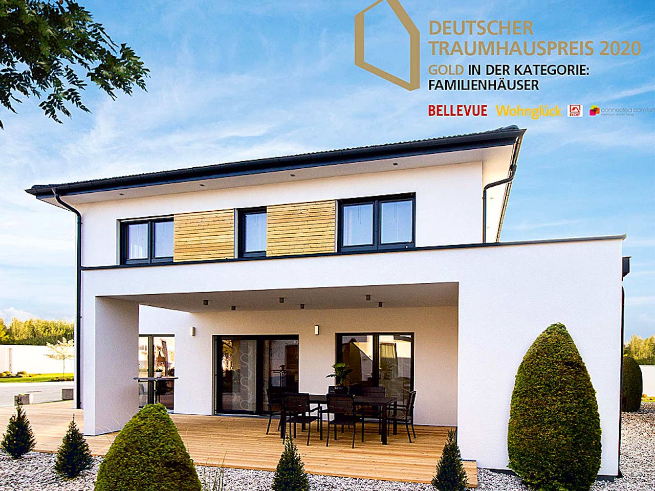 Aber nicht nur die Raumplanung innen überzeugt. Auch von außen besticht das Einfamilienhaus mit seiner Architektur im Stil einer modernen Stadtvilla. Besonderes Highlight dabei ist die wirklich riesige Terrasse, die um zwei Ecken läuft und zu einem Teil überdacht ist.