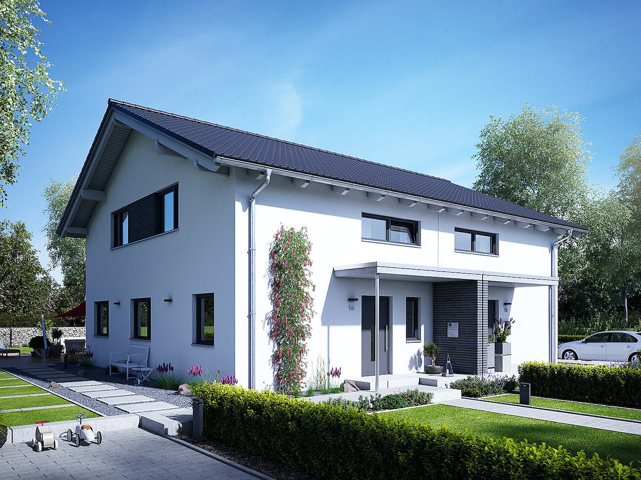 Hausentwürfe mit 25° Dachneigung und einem hohen Kniestock sind bei einem hohen Kniestock sind bei unserem Bauherren sehr beliebt. Die Gründe: Viel Kopffreiheit im Dachgeschoss, die moderne Außenansicht und eine Architektur, die in vielen Baugebieten genehmigt wird. Der Entwurf Doppelhaus 25-125 zeigt, wie sich das Wohnkonzept auch als klassisches Doppelhaus umsetzen lässt.
