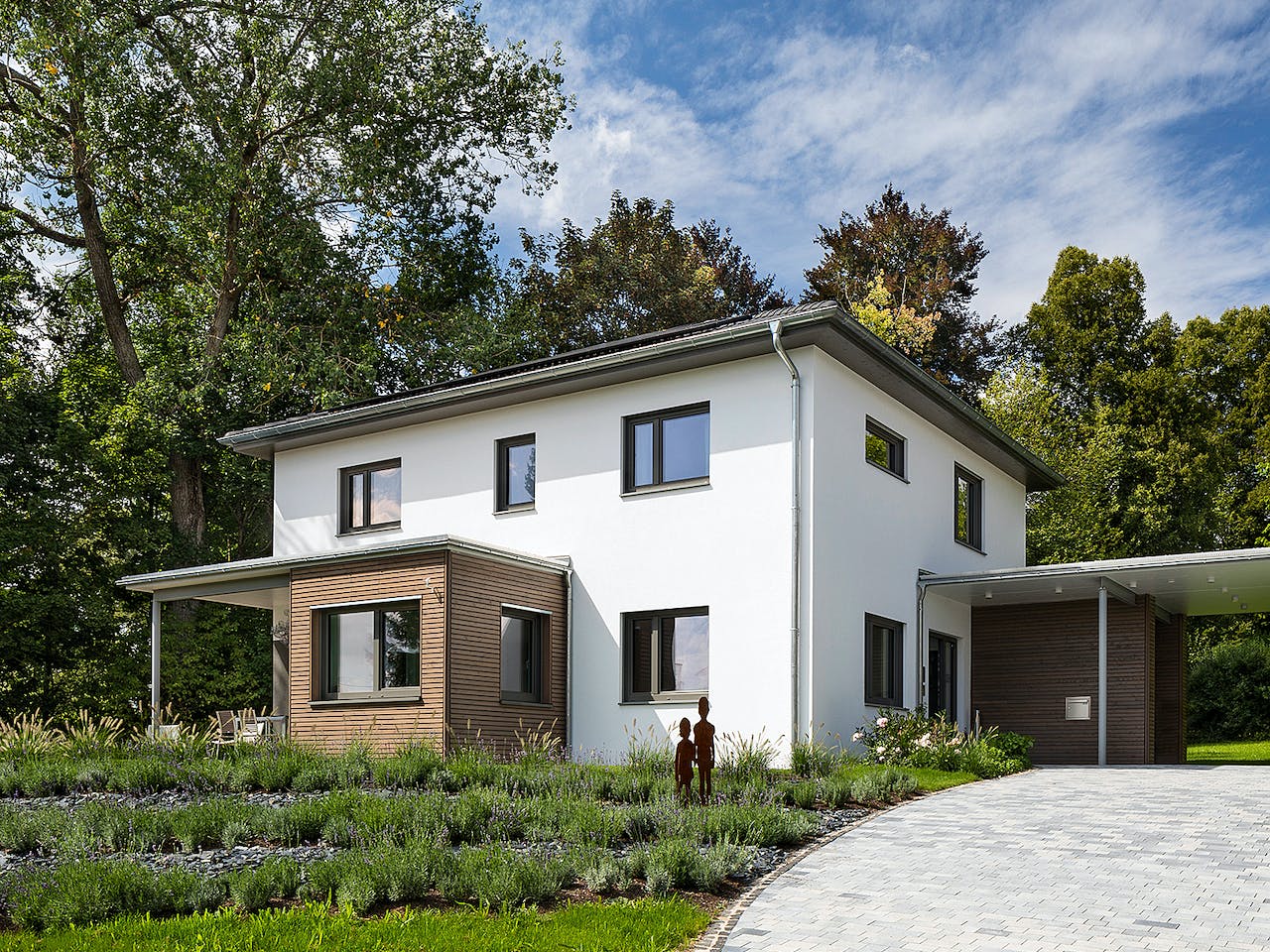 Als zweites Anbauteil fällt sofort der Carport auf, der auch den Eingangsbereich überdacht und Stellfläche für Fahrräder, Mülltonnen und Co. schafft.