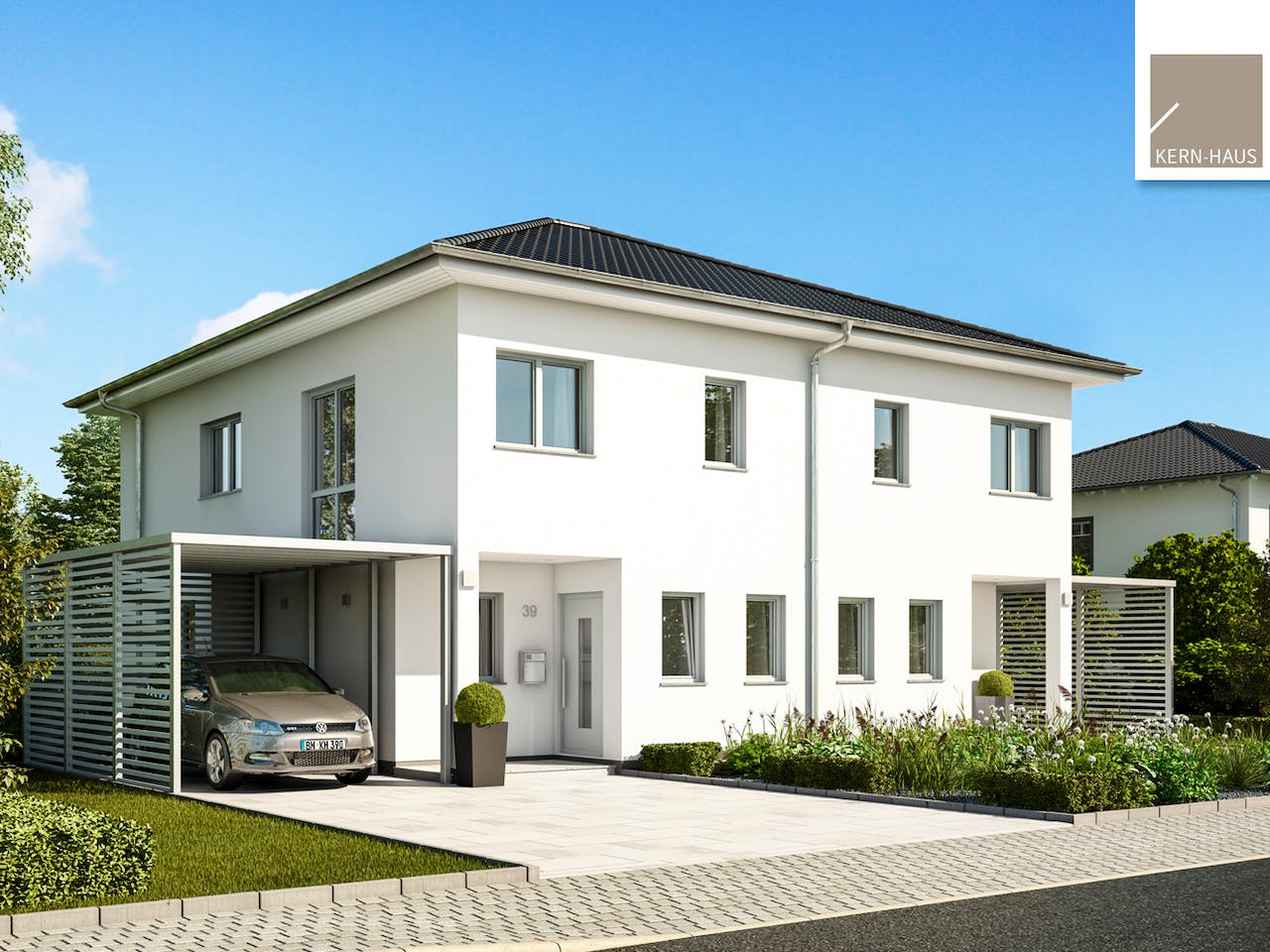 Ein Doppelhaus mit elegantem Charme. Verbunden durch ein gemeinsames Walmdach verschmelzen die beiden Doppelhaushälften optisch unter ihrem gemeinsamen Dach zur Optik einer stilvollen Stadtvilla.