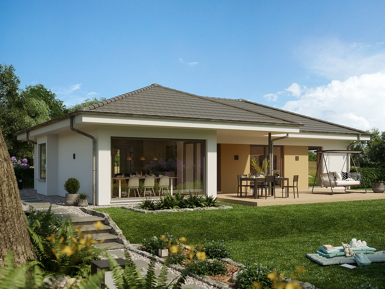 Im intelligent konzipierten Bungalow SOLUTION 110 kannst du dein Zuhause grenzenlos und ohne Schwellen genießen. Auf einer Ebene musst du dabei auf nichts verzichten und kannst alle deine Ideen ganz nach deinen Vorstellungen umsetzen. Große Gemeinschaftsbereiche, kuschelige Schlafräume und praktische Stauflächen machen diesen Bungalow zum perfekten Zuhause für dich und deine Familie. Und für noch mehr Platz gibt es flexible Wohnflächenerweiterungen oder architektonische Gimmicks wie zum Beispiel Giebelerker, Querhäuser oder Übereck-Panoramaerker. Mit dem SOLUTION 110 erleben Individualisten wie du, was das Wohnen auf einer Ebene so besonders macht.