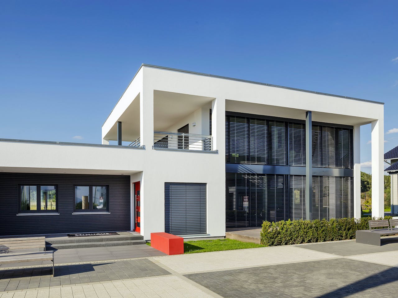 Bei diesem Haus trifft modernste Technik auf Bauhauszitate. Schmale Stützen, die das auskragende Dach tragen, der sich um die Glasfassade schmiegende Rahmen und die großzügige überdachte Dachterrasse verleihen dem sonst schlichten Baukörper Raffinesse und Eleganz. Seine ausgeklügelte Haustechnik ermöglicht es über Photovoltaik mehr Energieertrag als -verbrauch zu erwirtschaften. Ein zukunftsorientiertes Haus von zeitloser Ästhetik.