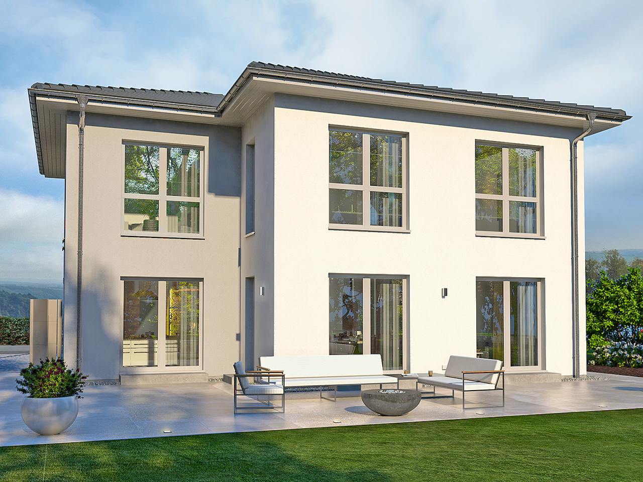 Mit ihrer klaren Linien- und Formgebung wirkt die Stadtvilla 23 puristisch-modern und fügt sich so problemlos in jede Wohnumgebung ein. Durch die besondere Fassadengestaltung ist sie en vogue und zeitlos gleichermaßen und besticht durch die großzügig verbauten, bodentiefen Fenster, die für lichtdurchflutete Räume und für ein Gefühl von Freiheit sorgen