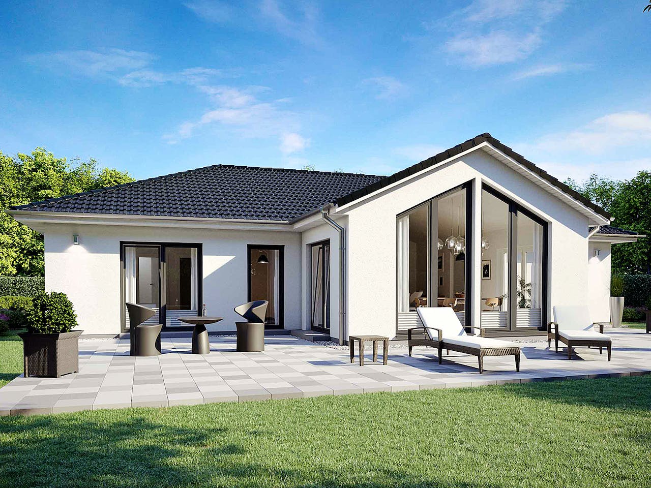 Dieser Winkelbungalow ist einfach ein Hingucker: Durch eine Kombination aus Kathedraldecke und Panoramaverglasung im Wohn-/Essbereich entsteht ein beeindruckendes Raumgefühl mit faszinierendem Ausblick. Getoppt wird das Ganze noch durch die optionale Überdachung des Freisitzes – mondän! Erker, überdachter Hauseingang und ein vergrößerter Dachüberstand gehören bereits zum Leistungsumfang bei drei Varianten. Unterschiede gibt es in der Zimmeranzahl und die Variante 3 zeigt eine seitliche Eingangslösung, wodurch sich die Anordnung der Zimmer ändert.