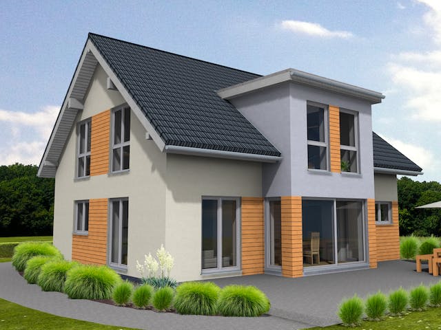 Die Häuser der Lifestyle-Familie erhalten ihren modernen Touch durch auffällige Erker mit besonderer Dachform. Bei diesem Entwurf fällt die Fassadengestaltung durch den Einsatz von holzverschalten Flächen in Verbindung mit verschiedenen dezenten Putzfarben sofort angenehm ins Auge.