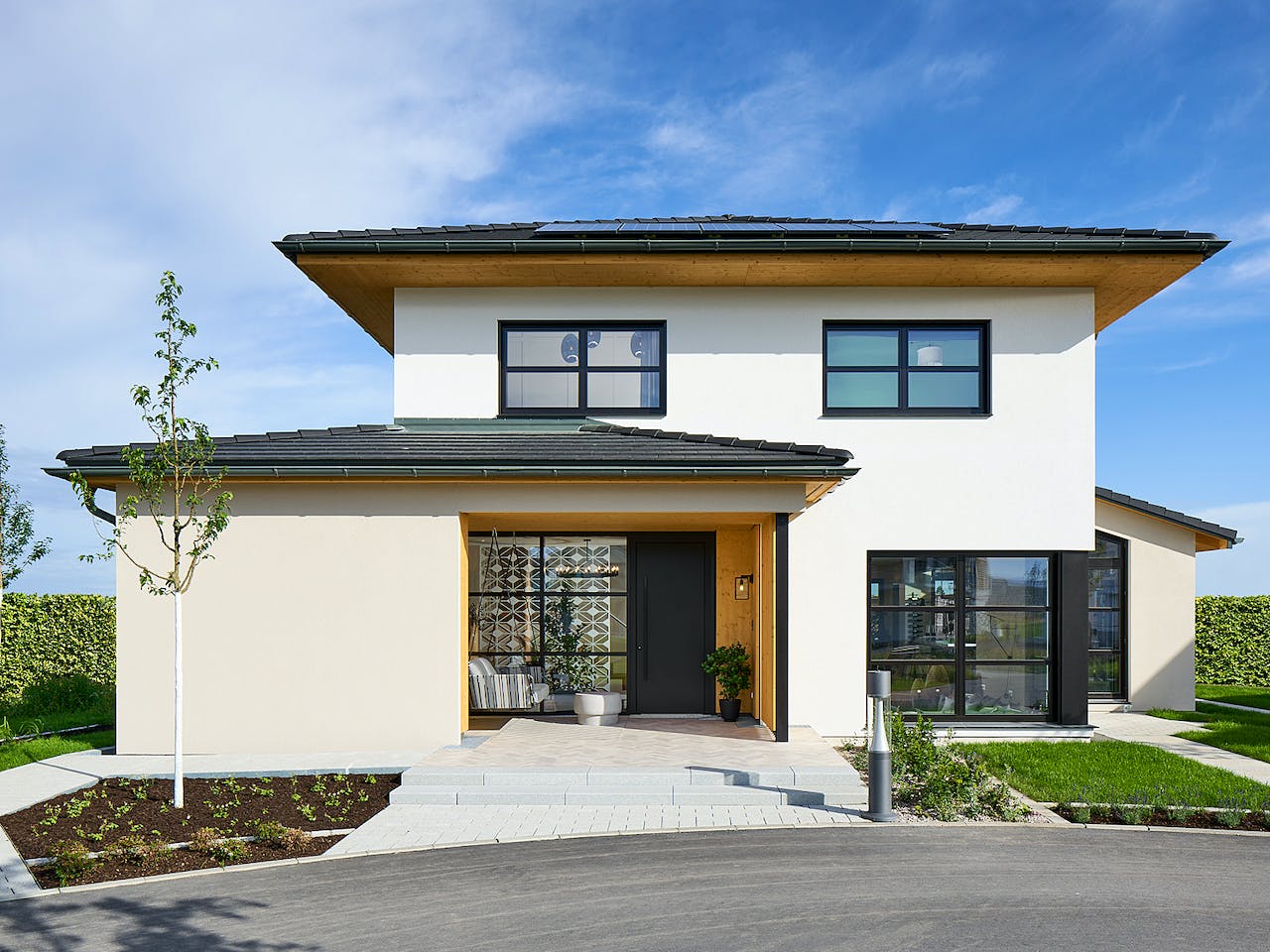 Das frei geplante Architektenhaus präsentiert sich als zeitlos stilvolles, zweigeschossiges Landhaus mit einem Walmdach. So wird der quaderförmige Baukörper durch Anbauten erweitert, die das Haus optisch bereichern und gleichzeitig funktional durchdacht sind. Aufgelockert wird die Putzfassade durch eine Holzschalung aus sibirischer Lärche. Die Sprossenfenster sind ein Klassiker, die im Industrie-Look modern interpretiert sind.