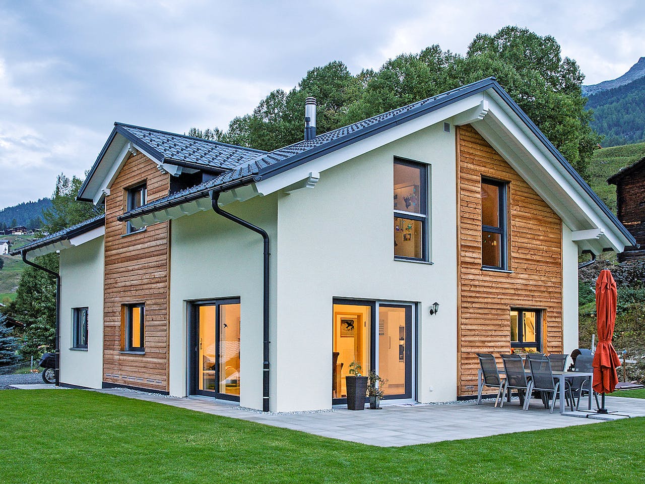Ein Traumhaus in einer Traumgegend hat unsere Schweizer Baufamilie in den Walliser Bergen verwirklicht. Mit dem Materialmix an der Fassade von Putz und Holz sowie einem dritten Giebel erhält das Haus in Anlehnung an die Baureihe Balance eine individuelle Note. Einen schönen Kontrast zum Holz bildet die eher kühle Farbwahl der Dachziegel.