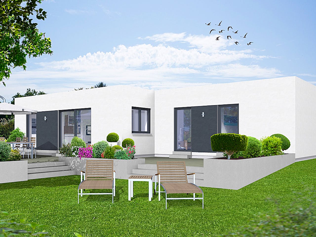 Das Flachdach und die klare Gestaltung sorgen für eine moderne Anmutung. Dazu tragen auch die anthrazitfarbigen Flächen bei. Der Grundriss bietet ein gutes Raumangebot bei vergleichbar kleiner Fläche.
