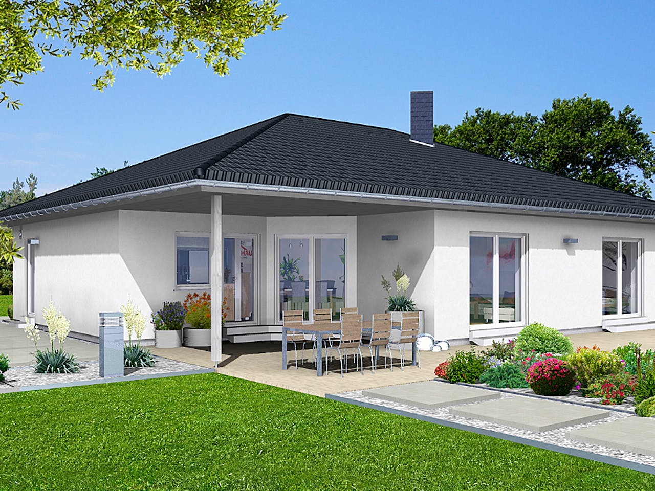 Dieser Winkelbungalow besticht durch seine symmetrische Gestaltung. So wird die Schräge des überdachten Eingangsbereichs auf der Terrasse wieder aufgenommen. Dadurch ergeben sich auch im Grundriss interessante Raumzuschnitte.