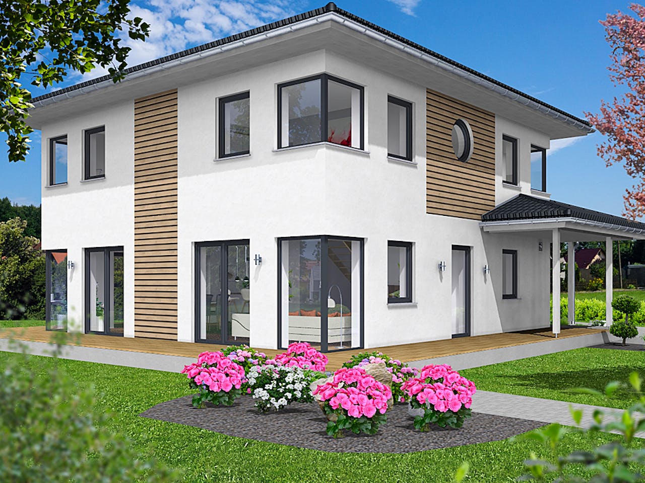Ausgewogene Proportionen, klare Symmetrie, akzentuierte Farbgestaltung – schon die Ansichten des 2-geschossigen Hauses mit Zeltdach vermitteln das angenehme Gefühl von Harmonie und Einheit. Hier passt alles perfekt zusammen. Im Innenbereich sorgen große Eckverglasungen für wohltuende Lichtspiele und phantastische Ausblicke.