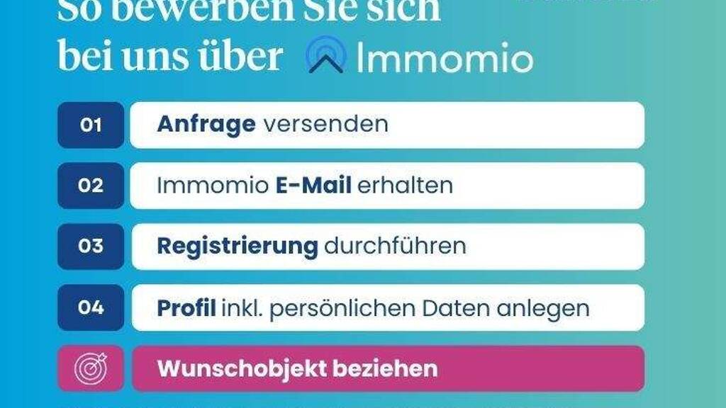 So funktioniert die Wohnungsbewerbung: Für unsere Wohnungsangebote verwenden wir das Immobilienportal Immomio. Dort können Sie sich schnell und einfach registrieren und Ihr Interesse an einer unserer Wohnungen bekunden. Auch die weitere Abwicklung erfolgt über Immomio - von der Vereinbarung des Besichtigungstermins über das Hochladen der erforderlichen Unterlagen bis hin zur Vergabe der Wohnung.