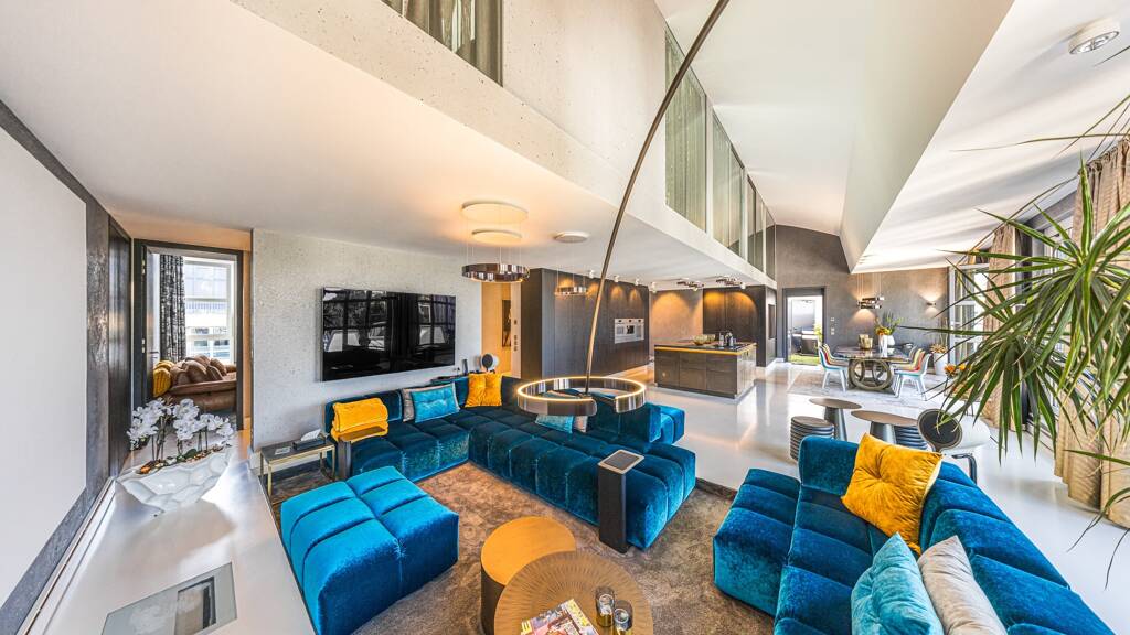 Ausstattung Das Herzstück der unteren Ebene bildet der großzügige und hochwertige Wohn-, Koch- und Essbereich, der sich auf knapp 100 m² erstreckt. Eine spektakuläre Aussicht über die Stadt flutet den Raum mit natürlichem Licht. Hier befindet sich ein Balkon.