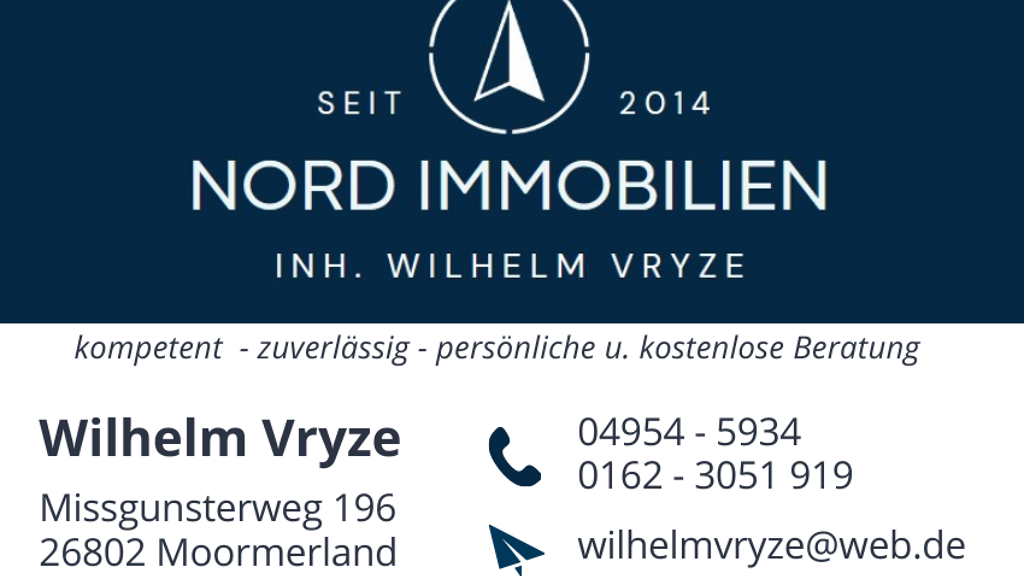 Nord-Immobilien Inh. Herr Wilhelm Vryze ( IHK Makler - Kfm.i.R.) Zulassung nach § 34c (GewO) Steuer ID Nr. 60/145/13888 Mail: wilhelmvryze@web.de Tel. 04954 - 5934 mobil: 0162 3051919