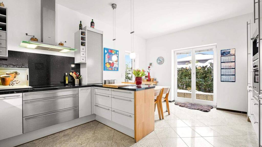 Eine Doppelgarage mit zusätzlichem Platz für Fahrräder, eine sonnige Südterrasse, weitere kleinere Terrassenbereiche sowie der liebevoll gepflegte Garten verleihen diesem Anwesen ein besonderes Maß an Wohnqualität, Flexibilität und Privatsphäre.
