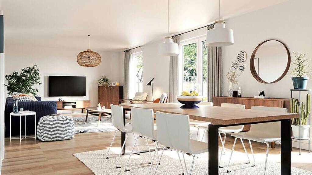 Das Mitwachshaus Flair 148 hat alles, was ein Haus zum Wohlfühlen benötigt: ein gemütliches Wohnzimmer mit hellem Essbereich und großen Fenstern, die viel Tageslicht hinein lassen. Die geräumige Küche bietet nicht nur Platz für das Familienfrühstück unter der Woche.