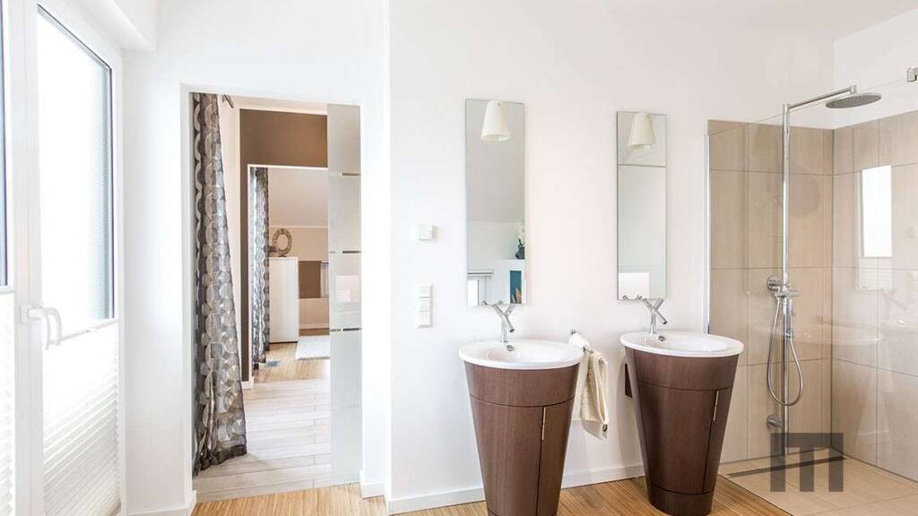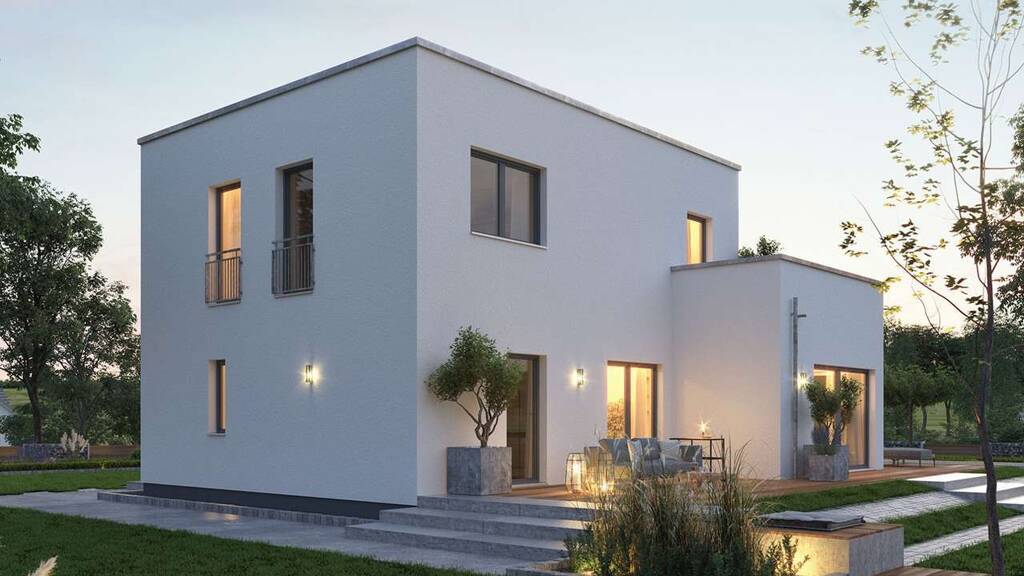 + Satteldach mit selbstreinigender Ziegeleindeckung, sturmverklammert + Dachrinnen und Fallrohre aus Titanzink + Dreifach-verglaste Wärmeschutzfenster + Außenfensterbänke aus Aluminium + Rollläden aus Aluminium + Haustür mit Edelstahlgriff und Mehrfachsicherheitsverriegelung + Freiraumupgrade auf 2,75 m Deckenhöhe im Standard + Mineralischer Struktur-Außenputz in weiß + Bodenplatte (Keller optional) inkl. Bodengutachten + Installation Luft-Wasser-Wärmepumpe mit Fußbodenheizung + Elektroinstallation + Photovoltaikanlage + Sanitärrohinstallation + Installation Be- und Entlüftungsanlage + Buchenholztreppe + Trockenbau (Dämmung + Beplankung) - Material +Grundstückskosten (aktueller Bodenrichtwert ist eingerechnet)