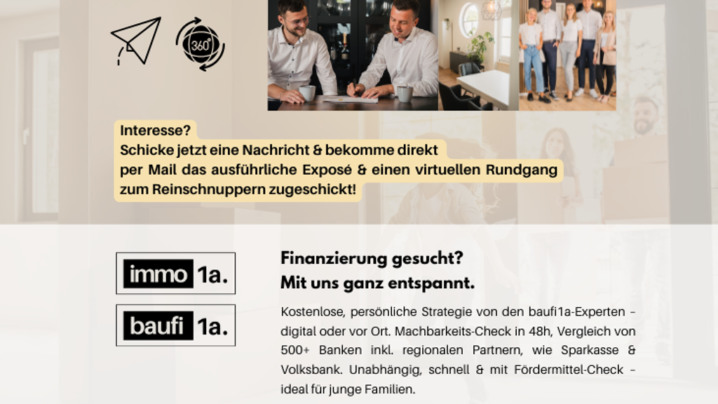 Die Provision i.H.v. 3,57 % des Kaufpreises (inkl. 19 % gesetzlicher MwSt.) ist nach Abschluss des notariellen Kaufvertrages an die Firma immo1a GmbH zu entrichten.