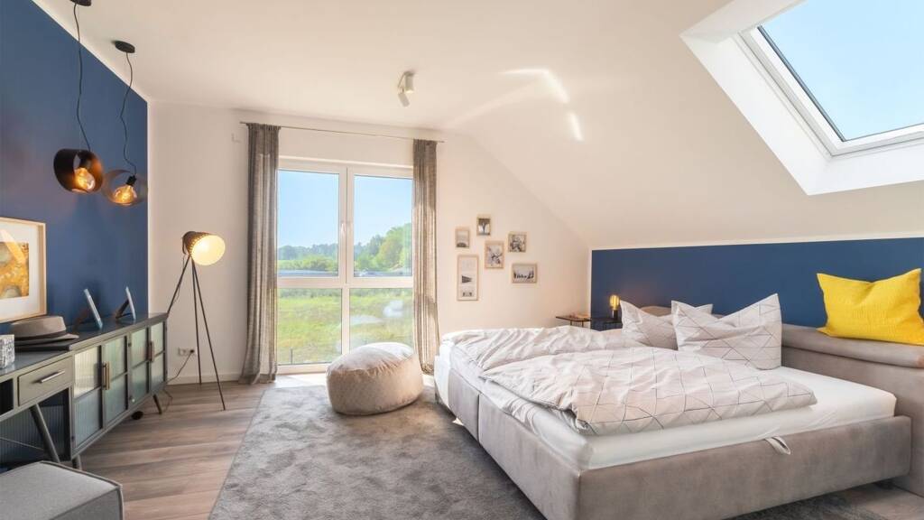 Das Haus ist ausgestattet mit hochwertigen baulichen und technischen Details: Dreifach verglaste Fenster inklusive Aluminiumrollläden, eine effiziente Luft-Wasser-Wärmepumpe, Echtholztreppe, kontrollierte Be- und Entlüftungsanlage mit Wärmerückgewinnung sowie ein Dämm- und Beplankungspaket sorgen für ein behagliches Wohnklima und hohe Energieeffizienz. Die Innenausstattung umfasst Bodenbeläge, Tapeten, Sanitärobjekte, Innentüren mit Zargen und Fliesen. Zudem profitieren Sie von einer lichten Raumhöhe von 2,75 m und einer modernen Haustechnik inklusive Rohrleitungen. Die detaillierten Ausbauanleitungen und der persönliche Ausbauberater unterstützen Sie bei der Umsetzung Ihres Innenausbaus.
