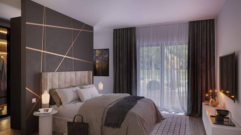 Dass es sich um ein Doppelhaus mit zwei nebeneinanderliegenden Wohnungen handelt, bemerkt man erst bei genauerem Hinschauen. Das liegt vor allem daran, dass die beiden Hauseingänge auf verschiedenen Seiten des Gebäudes platziert wurden. Empfangen werden Bewohner und Besucher in beiden Haushälften von einer geräumigen Diele, an die ein Gäste-WC und ein Abstellraum angrenzen. Ganz im mediterranen Stil präsentieren sich die Gemeinschaftsräume als offene Wohnfläche, die viel Raum für die gemeinsamen Aktivitäten bietet. Eine platzsparende, halb gewendelte Treppe führt hinauf in das Obergeschoss, das sich als wahre Wohlfühlzone entpuppt. Zwei große Schlafräume mit Platz für einen großen Kleiderschrank, einen Schreibtisch oder eine schicke Frisierkommode lassen die Herzen von Eltern und Nachwuchs gleichermaßen höherschlagen. Ein gemütliches Familienbad rundet das Raumkonzept der oberen Etage ab. Die Heiz- und Haustechnik ist in einem zentralen Technikraum untergebracht, der von außen zugänglich ist.