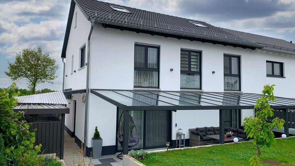 Dieses hochwertig ausgestattete, einseitig angebaute Einfamilienhaus befindet sich auf einem ca. 322 m² großem Grundstück in einer attraktiven Wohnlage und bietet idealen Komfort. Das im Jahr 2020 erbaute Haus verfügt über ca. 163 m² Wohnfläche, die wie folgt aufgeteilt ist: Im Erdgeschoss finden Sie einen einladenden, überdachten Eingangsbereich und einen großzügigen Flur. Das Gästebad ist ausgestattet mit einer bodengleichen Dusche, Duschabtrennung, Toilette, Waschbecken und Handtuchheizkörper. Zudem gibt es einen kleinen Stauraum unter der Treppe. Der offene Wohn- und Essbereich ist lichtdurchflutet und bietet Zugang zur großen, überdachten Terrasse sowie zum Garten. Die hochwertige Einbauküche fügt sich perfekt in den Raum ein. Daneben befindet sich die praktische Speisekammer. Ein zusätzliches Zimmer befindet sich ebenfalls im Erdgeschoss. Im Obergeschoss erwarten Sie das Hauptschlafzimmer, zwei geräumige Kinderzimmer sowie ein stilvoll ausgestattetes Badezimmer mit Badewanne, bodengleicher Dusche und Doppelwaschbecken. Im Technikraum sitzt die Wärmepumpe, und im großzügigen Flurbereich ist Platz für Waschmaschine und Trockner. Über eine Treppe gelangen Sie ins ausgebaute Dachgeschoss, wo sich zwei weitere Zimmer befinden.