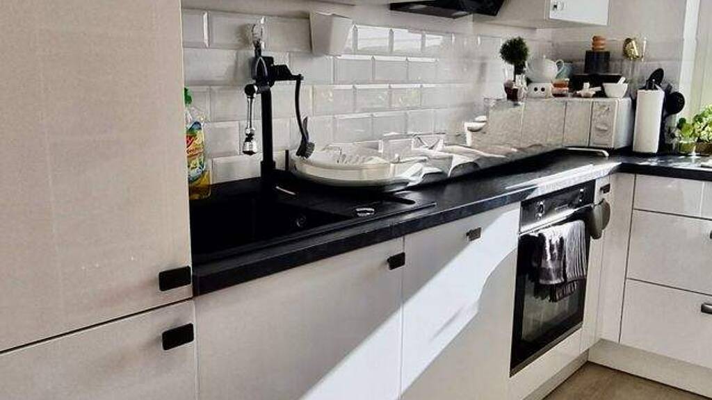 Die Ku¨che ist mit dem großem Fenster schön hell