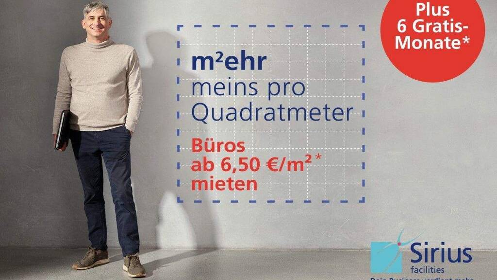 Sonstiges *Das Angebot ist abhängig von der Verfügbarkeit und ist nicht kombinierbar mit anderen Rabatten und Aktionen. Das Angebot gilt, sofern die beidseitige Vertragsunterschrift bis zum 16.03.26 geleistet wurde und bezieht sich auf Verträge mit einer Mindestlaufzeit von 36 Monaten. Das Angebot bezieht sich zudem ausschließlich auf die Kaltmiete, Nebenkosten sind zu zahlen. Ausgenommen von der Aktion sind Büros mit einer All-in-Miete.