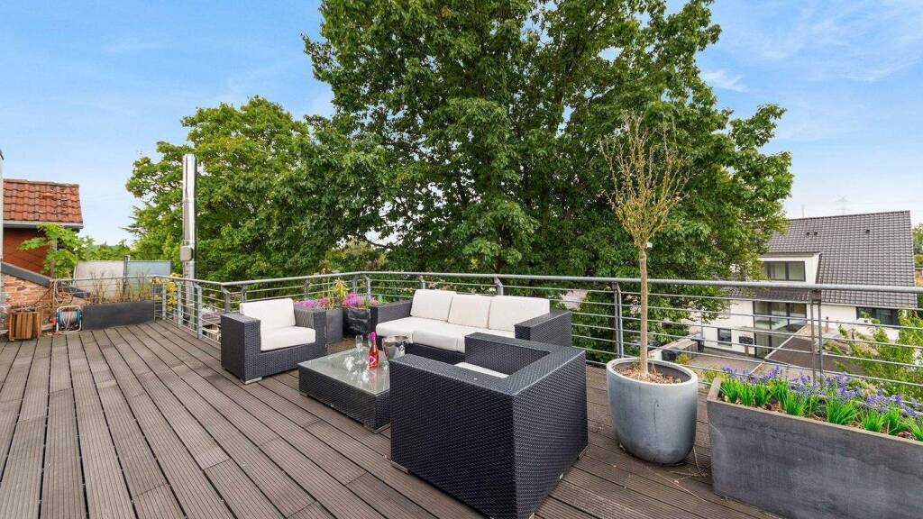 Ein echtes Highlight ist die großzügige Dachterrasse in Südwestlage: ausgestattet mit Markise bietet sie den perfekten Rückzugsort für entspannte Sonnenstunden und einen herrlichen Ausblick.