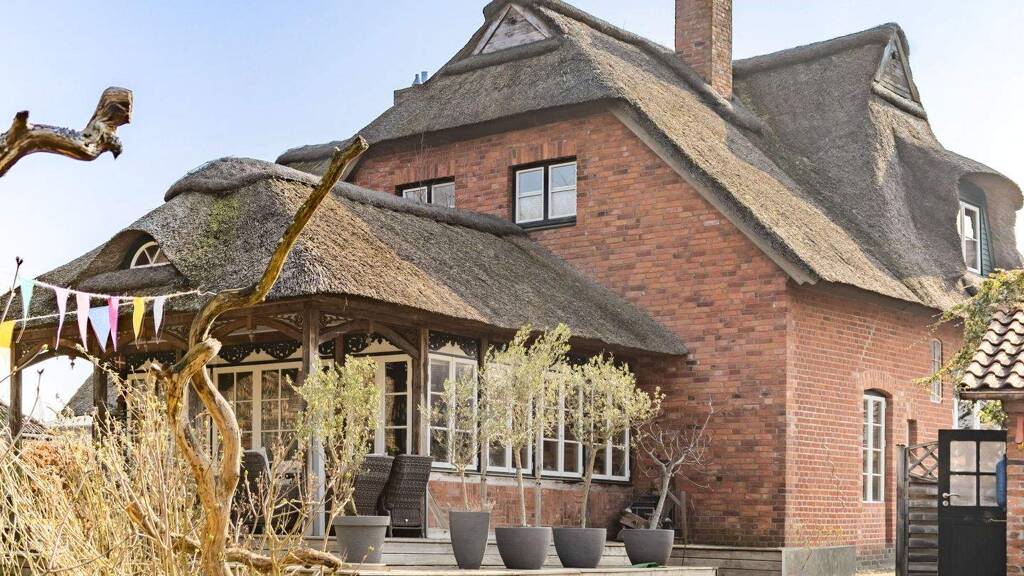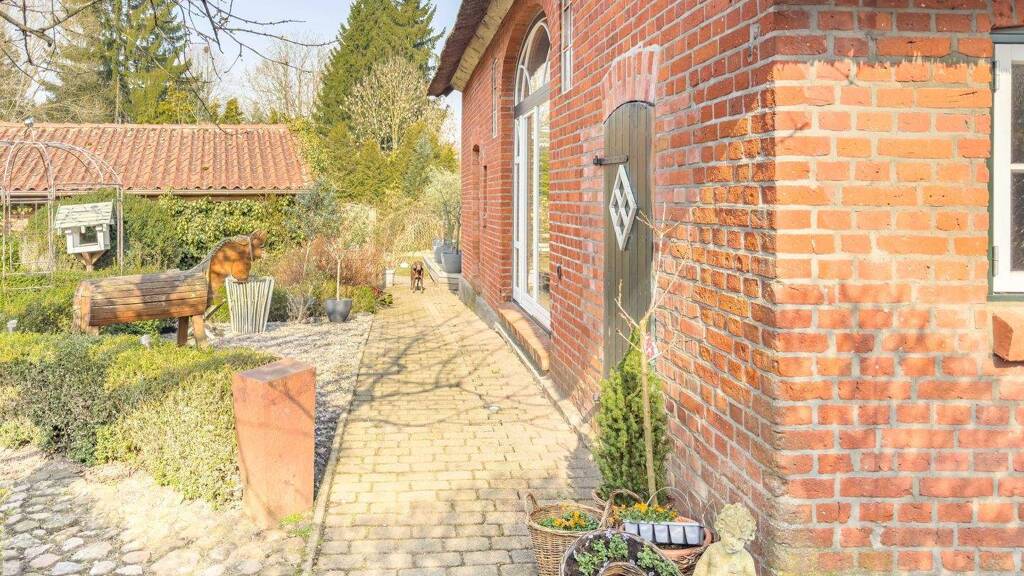 Dieses wunderschöne Reetdachhaus vereint historischen Charme mit modernem Wohnkomfort und bietet auf ca. 280 m² Wohnfläche ein ganz besonderes Zuhause. Ursprünglich im Jahr 1840 erbaut und laufend saniert sowie modernisiert, präsentiert sich die Immobilie heute in einem sehr gepflegten Zustand. Das großzügige Grundstück mit ca. 2.472 m² ist liebevoll angelegt und schafft eine idyllische Atmosphäre. Bereits beim Betreten empfängt ein einladender Eingangsbereich mit Kachelofen. Von hier aus gelangen Sie in den Hauswirtschaftsraum sowie in ein erstes Schlafzimmer. Der anschließende Flur mit hohen Decken führt weiter in den Wohnbereich und wird durch eine stilvolle Holztreppe ergänzt, die ins Obergeschoss führt. Hinter einer eleganten Holz-Flügeltür öffnet sich das großzügige Wohnzimmer mit sichtbaren Balken, großer Fensterfront und einem angrenzenden Arbeitszimmer, das aktuell durch eine Schiebetür abgetrennt ist. Die offene Wohnküche mit Kochinsel bildet das Herzstück des Hauses und bietet durch die zahlreichen Fenster einen herrlichen Blick in den Garten. Ein weiterer Kachelofen sorgt auch hier für eine besonders wohnliche Atmosphäre. Der genehmigte Essbereich im Anbau mit direktem Zugang zur überdachten Terrasse schafft einen fließenden Übergang zwischen Innen- und Außenbereich. Ergänzt wird das Erdgeschoss durch ein weiteres Schlafzimmer, ein Vollbad sowie den Heizungsraum. Über eine schöne Treppe gelangt man in das Zwischengeschoss mit einem weiteren Schlafzimmer und darüberliegendem Dachboden. Im Dachgeschoss befinden sich eine offene Galerie, ein Schlafzimmer mit Ankleide sowie ein Badezimmer mit Whirlpool. Der Außenbereich überzeugt durch einen liebevoll gestalteten Garten mit Pool (derzeit außer Betrieb), ein reetgedecktes Gartenhaus sowie zwei Nebengebäude mit praktischen Abstellmöglichkeiten. Eine großzügige Zufahrt mit Stellplätzen rundet dieses besondere Angebot ab. Dieses Reetdachhaus bietet ein Wohngefühl, das man selten findet