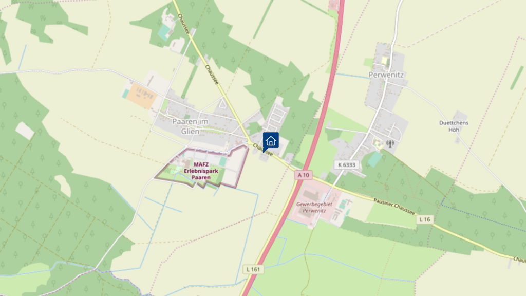 Paaren im Glien ist ein Ortsteil der Gemeinde Schönwalde (Glien) im beliebten Havelland und wird regelmäßig mit dem Bus zwischen den Bahnhöfen Falkensee und Brieselang bedient. Ferner ist man in wenigen Minuten auf der A10 und fährt über die L16 zu diversen Knotenpunkten. Nach Berlin (Stadtrand) benötigen sie ca. 35-35 Minuten mit dem Auto (jje nach Lage)