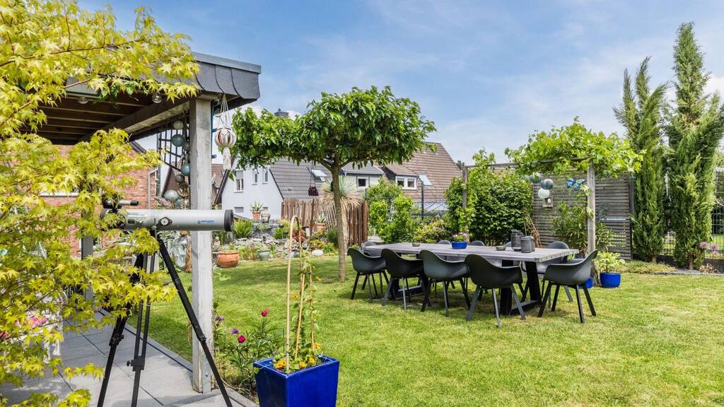 Der Außenbereich passt sich dem großzügigen Charakter des Hauses perfekt an. Der tief angelegte, gepflegte Garten vermittelt echtes Urlaubsgefühl, verfügt über eine gemütliche Lounge-Ecke und einen zusätzlichen Abstellraum. Vor dem Haus gibt es eine breite Einfahrt, einen Carport und eine Garage – so wird das Parken zum Kinderspiel.