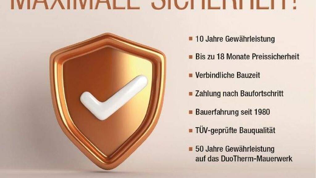 Maximale Sicherheit bei Kern-Haus: + 10 Jahre Gewährleistung auf die wesentlichen Bauleistungen + Bis zu 18 Monate Festpreisbindung + 50 Jahre Gewährleistung auf das DuoTherm-Mauerwerk + Verbindliche Bauzeit + Zahlung nach Baufortschritt