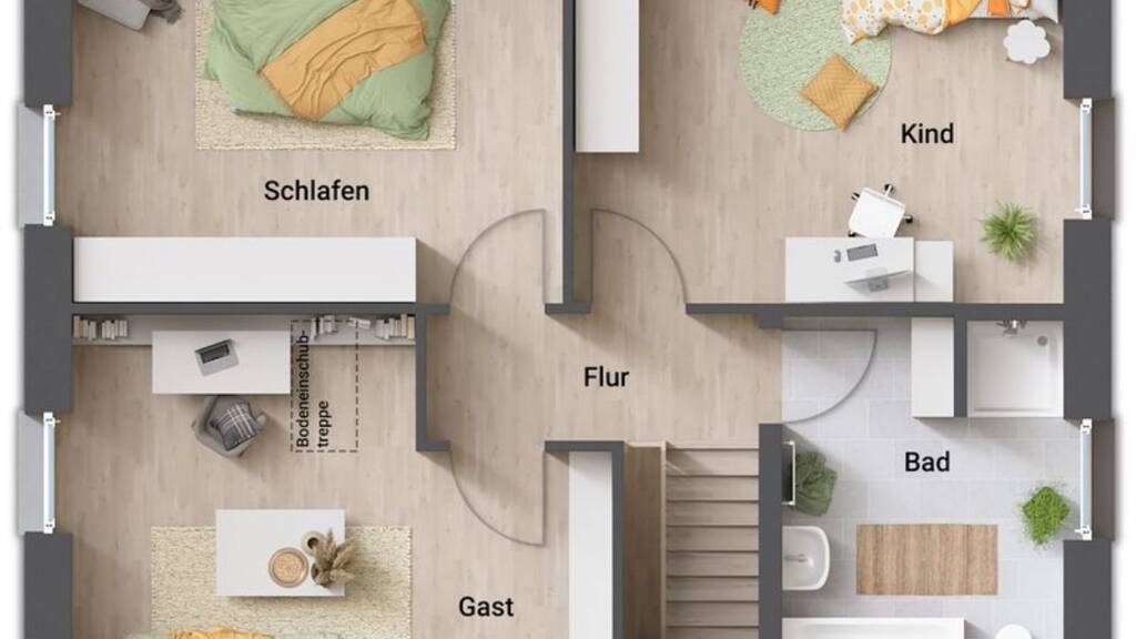 Im Obergeschoss befinden sich ein gemütliches Schlafzimmer, ein modernes Bad und zwei weitere Räume, die als Kinder-, Gäste- oder Arbeitszimmer genutzt werden können. Auch von außen ist das Edition Clever 138+ ein optischer Hingucker. Zusätzlich überzeugt eine kurze Bauzeit.