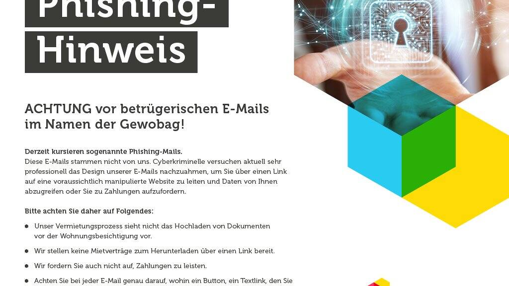 ACHTUNG: Cyberkriminelle versuchen sehr professionell das Design unserer E-Mails nachzuahmen, um Sie über einen Link auf manipulierte Websites zu leiten und persönliche Daten von Ihnen zu erlangen oder Sie zu Zahlungen aufzufordern. Unser Vermietungsprozess verlangt kein Dokumentenupload vor der Wohnungsbesichtigung. Wir stellen keine Mietverträge über einen Download-Link bereit. Wir fordern Sie auch nicht auf, Zahlungen zu leisten. Achten Sie bei jeder E-Mail genau darauf, wohin ein Button (Link) den Sie anklicken sollen, oder die E-Mail, wenn Sie auf "Antworten" gehen, führt. Unsere Angebote sind provisionsfrei. Als Mieter zahlen Sie für die Vermittlung des Mietvertrags keine Provision, sofern Sie nicht selbst einen Vermittler/Makler beauftragt haben. Im Auftrag der Gewobag tätige Vermittler werden keine Provision von Ihnen verlangen.