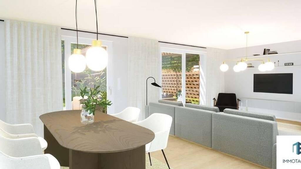 Im Erdgeschoss erwartet Sie ein einladender Wohn- und Essbereich, der durch bodentiefe Fenster lichtdurchflutet ist und einen direkten Zugang zur großzügigen Terrasse und dem privaten Garten bietet - ideal für entspannte Stunden im Grünen oder gesellige Abende mit Freunden. Die separate Küche bietet ausreichend Platz für Kochvergnügen und Familienleben und lässt sich bei Wunsch auch offen gestalten. Der separate Abstellraum kann dabei als Vorratskammer oder als Haushaltsfläche genutzt werden. Die offene Treppe im Erdgeschoss führt in das Obergeschoss, wo sich die Schlafräume und das Badezimmer befinden.