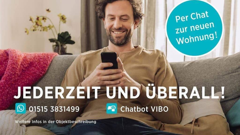 Kontaktieren Sie uns auch über den Messenger WhatsApp auf Ihrem Smartphone. Schreiben Sie uns die Objekt-ID 28477-22-M in WhatsApp an 01515 3831499. Alternativ können Sie Ihre Wohnungsanfrage auch an unseren Chatbot VIBO auf unserer Homepage richten.